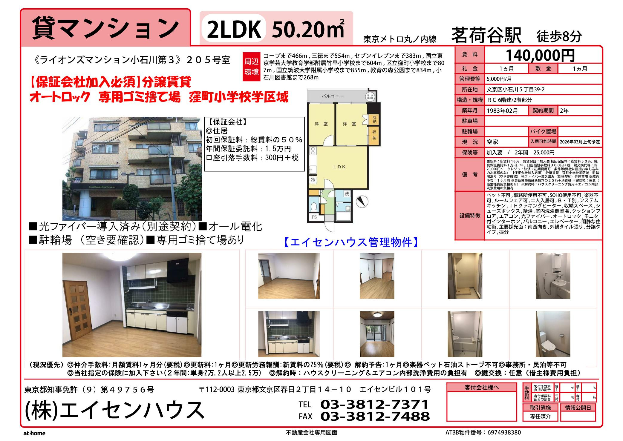 ■文京区内でも小石川5丁目・4丁目は静かな住宅街・翠も沢山・図書館なども有り、然も「駅近く」お買い物も便利!少々手前ミソ、かもしれませんが是非、お立ち寄りいただければと思います。また、空室が出ましたら是非ご検討お願いいたします。