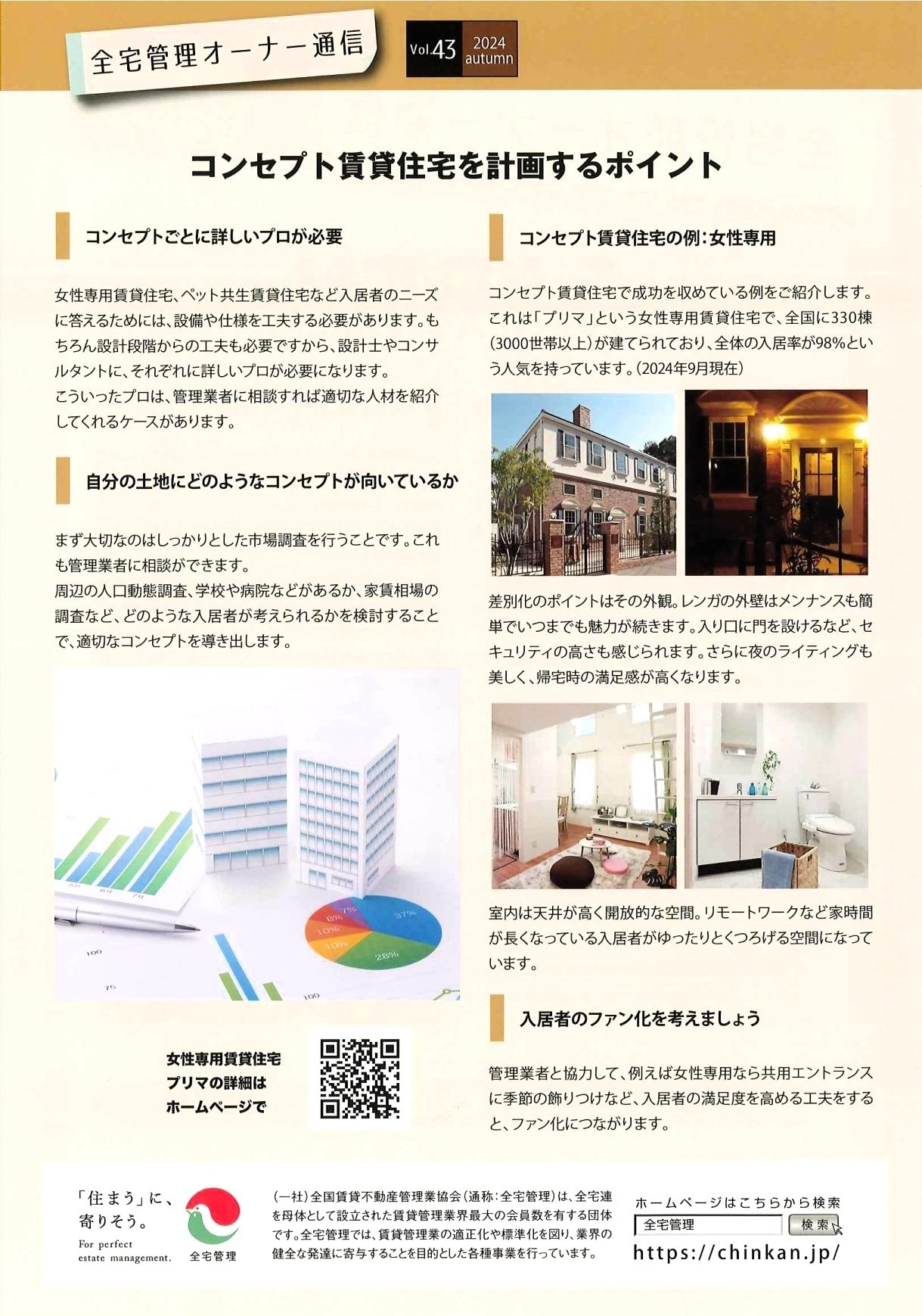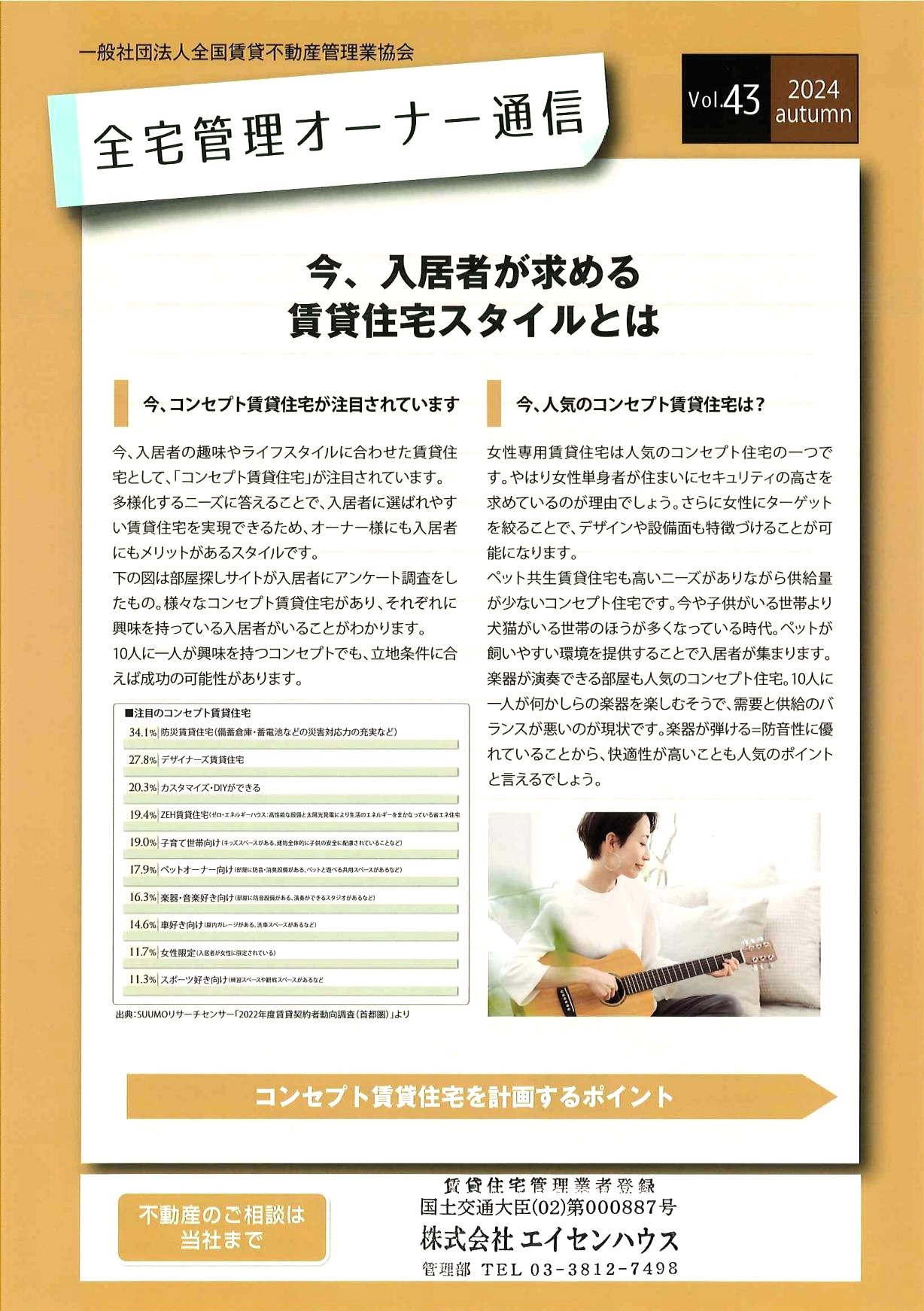 ■全宅管理では定期的に賃貸経営のオーナー様向けに「全宅管理オーナー通信」を発行しています。2024年秋号が送られてきましたのでご紹介と思います。