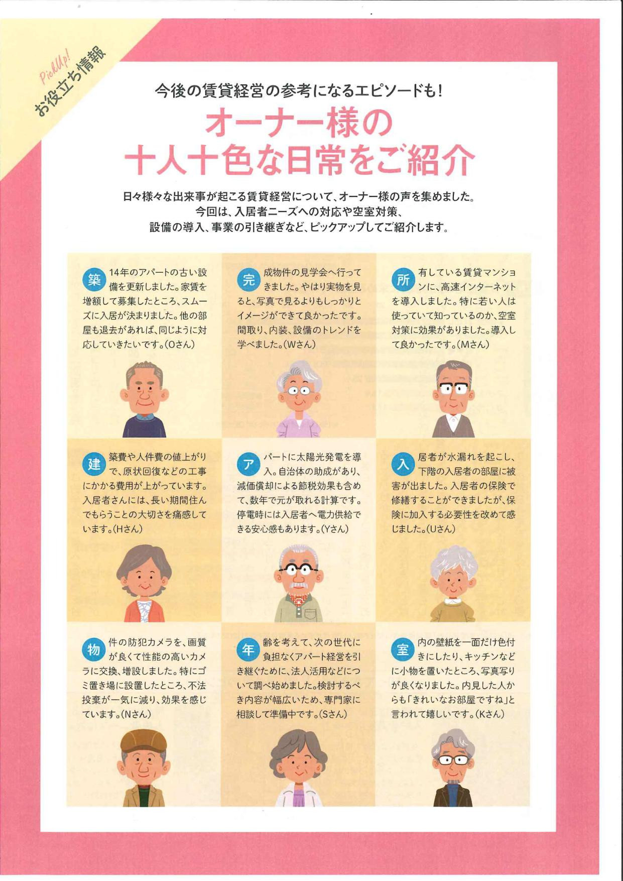 ■今月号の『お役立ち情報』はオーナー様の「十人十色」な日常のご紹介とのこと。今後の賃貸経営の参考・ヒントになるエピソード!もあるかもしれません。👇👇👇