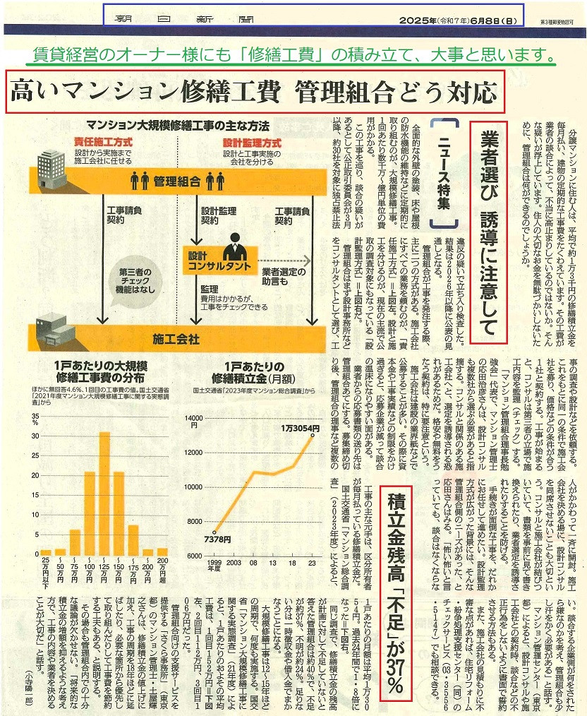 其のニュースとは・・分譲マンションでの修繕工費(費用)が高い(高騰)している、との内容です。
