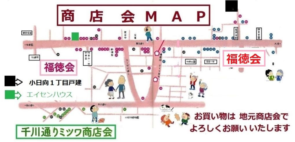 茗荷谷駅前の春日通り沿いは地元の商店会が形成されています。お買い物は是非!地元の商店にてお願い出来ればと思います。
