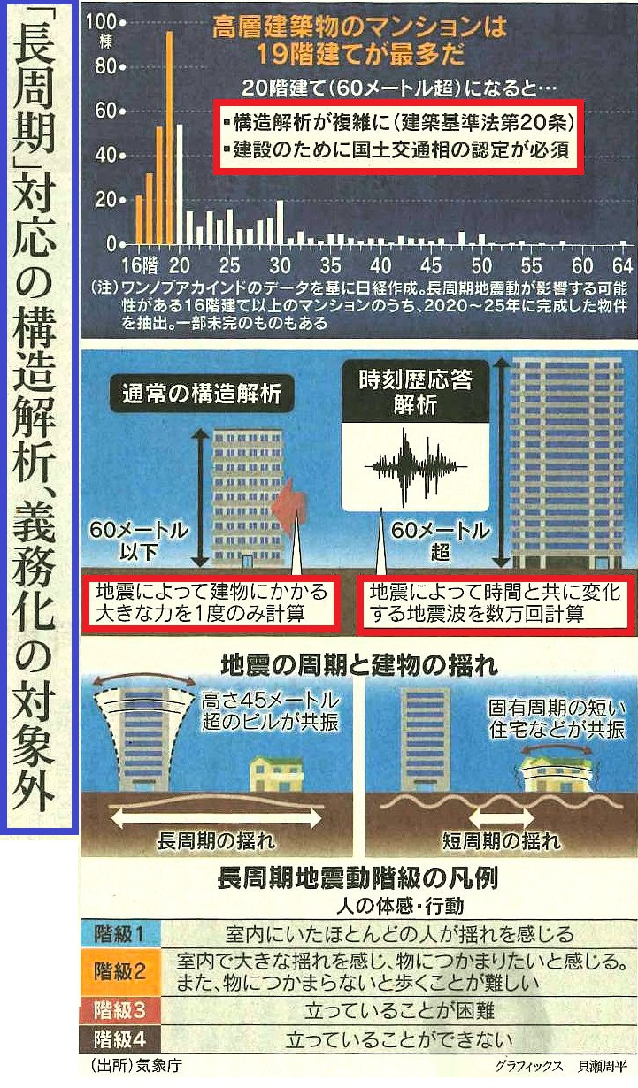 そこで今回のブログの内容は?超高層のタワーマンションも中高層のプチタワマンでも、大地震に対する設計の耐震設計は強固ですが、中高層のプチマンションでは、揺れ、特に「長周期の揺れ」に対する建物構造解析が「義務化」されていないとのことです。