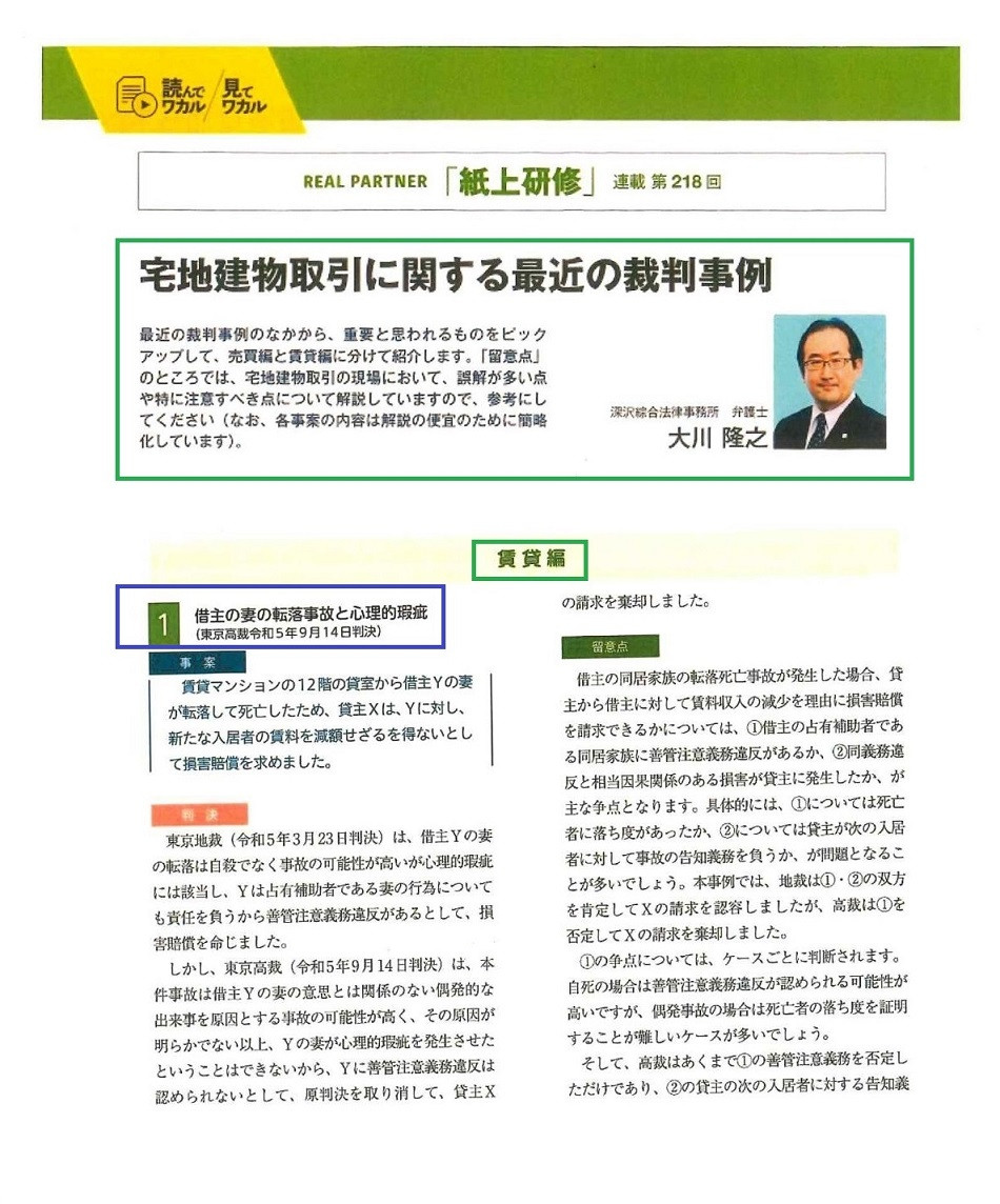 全国宅地建物取引業協会連合会(通称:全宅連)発行マガジンからのご紹介。弁護士による最近の裁判事例を紙上研修にて。