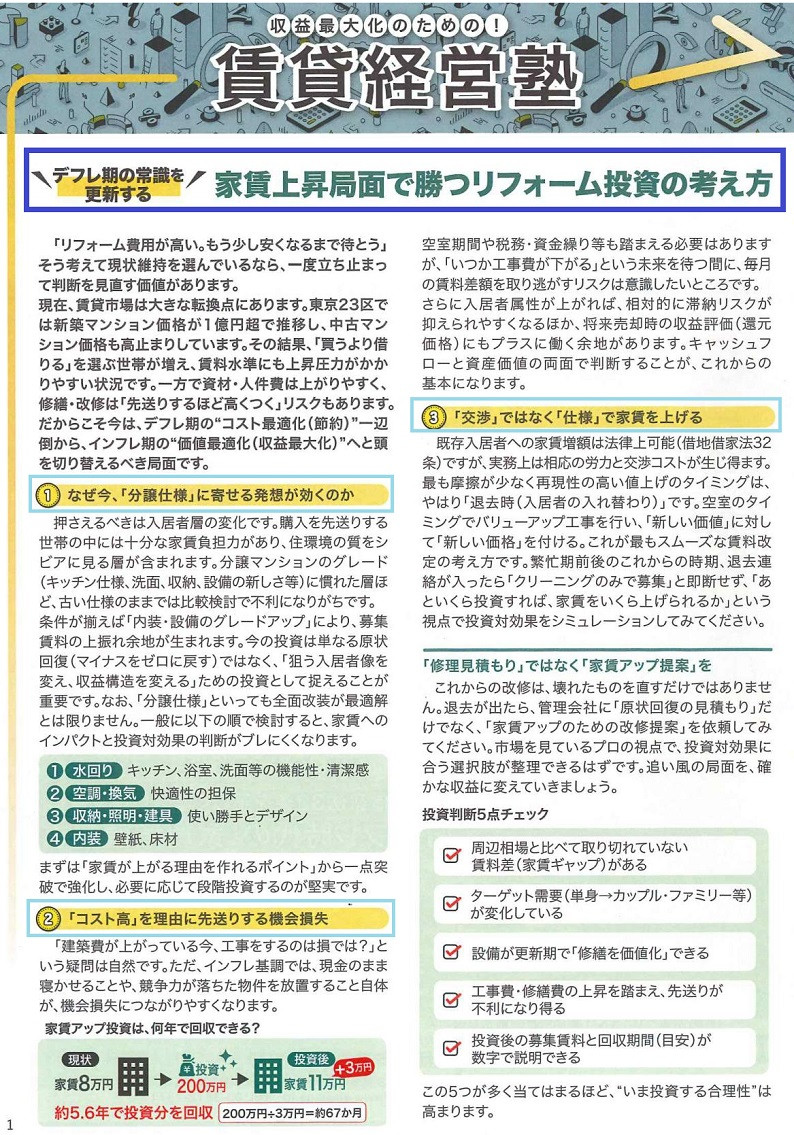 記事1として「収益最大化のための!賃貸経営塾:家賃上昇局面で勝つ!リホーム投資の考え方」