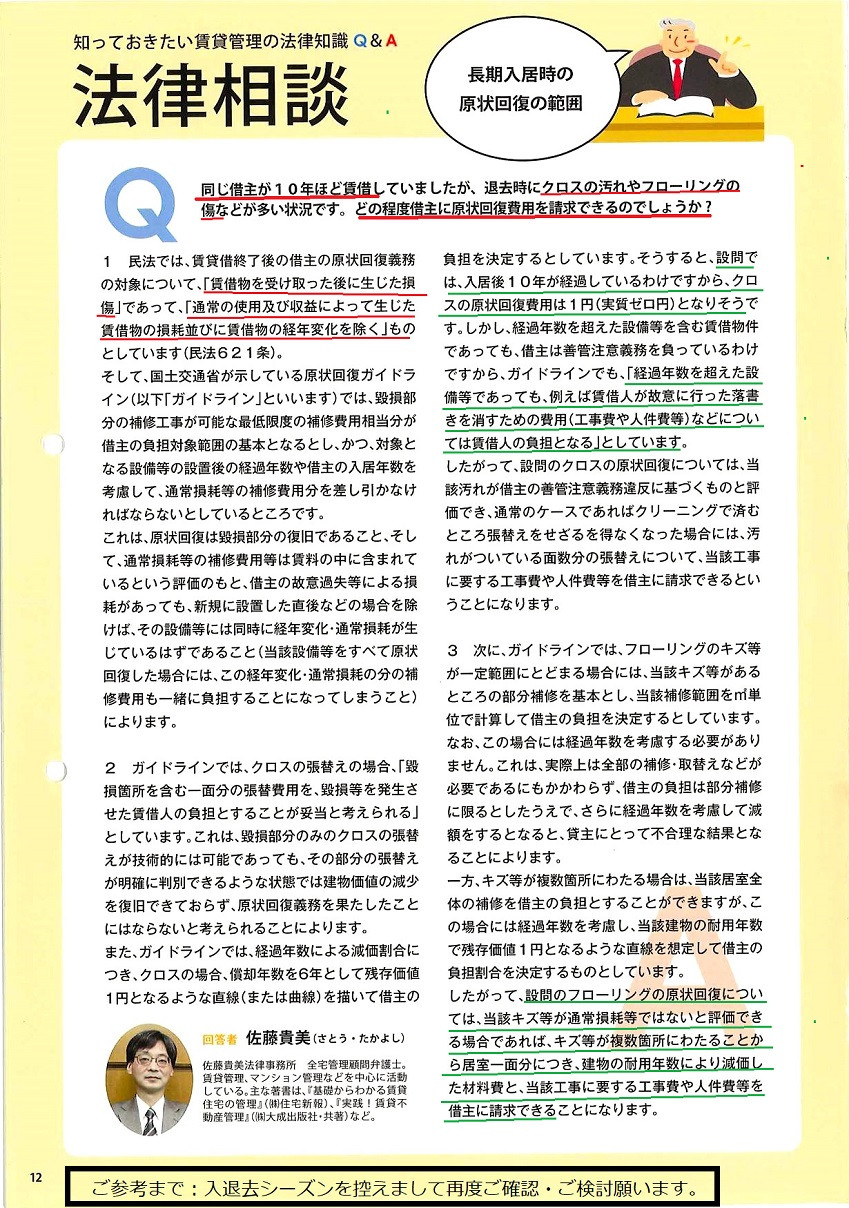 とほ、申しましても春先の引っ越しのシーズンには変わりはございません。そこで、再度(少々しつこいと思われますが)ではございますが引っ越し後の『原状回復の範囲は』、特に『長期で入居頂けていた後の』場合について再度と思います。