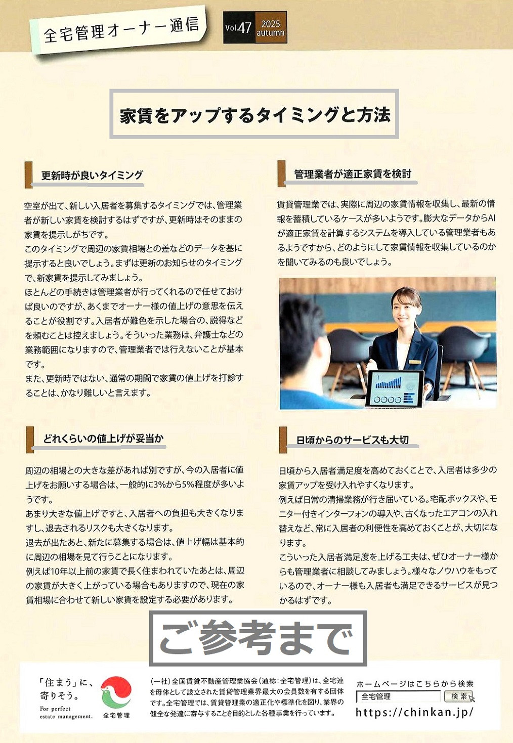 👇👇👇エイセンハウスも加入しています「全宅管理」発行の、賃貸経営オーナー様むけの「オーナー通信」を貼付しましたので、是非参考にして頂ければと思います。お目通しいただければと思います。