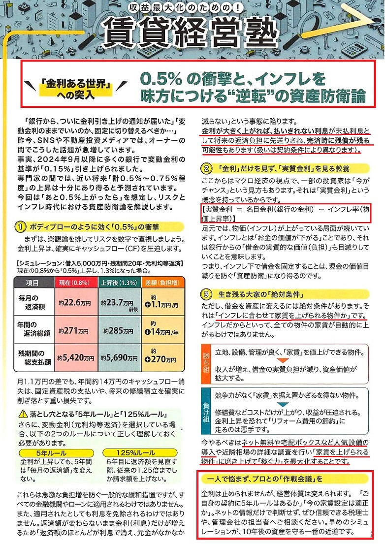 エイセン通信今月2月号は、現在到来中の繁忙期対策の3つの方法、また、賃貸経営オーナー様へ金利のある世界とは、2つのテーマについて記載しております。