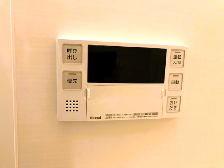 風呂のコントロールパネル写真です。「右下のスイッチを!」思い切って追い炊き機能に!