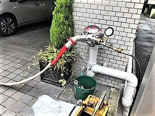 エイセンハウスの管理物件でのことですが、定期的に点検をして参りまして、都度、点検をクリアしてきましたが、やはり、或る程度築年数が経過をして来ますと、色々な箇所の修繕が当然のことながら必要となって来ます。今回の必要箇所は本ブログにもあります「連結送水管」でした。点検しました結果、通常の水圧が時間経過と共に下がり始めてしまいました。何処かに亀裂が生じている証拠だと思います。そこで、早急に改修工事を施しまして、完成をしたのですが再度の点検を行っている様子のご紹介写真を以下に貼付しました。