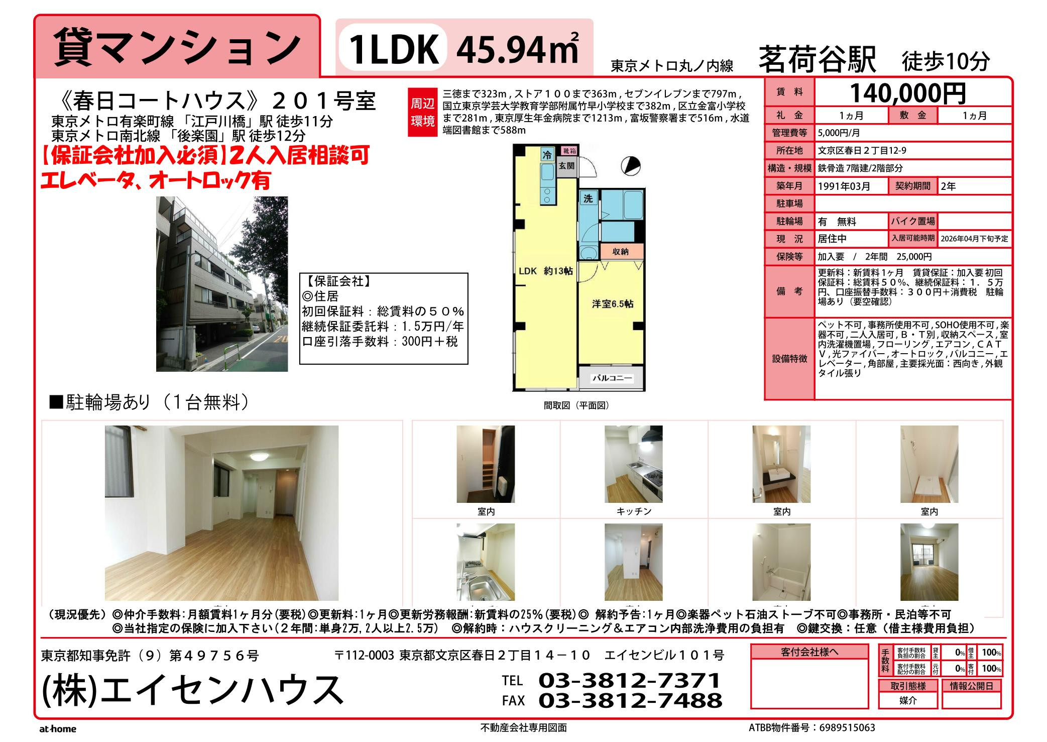 春日コートハウス:文京区春日2丁目賃貸物件【茗荷谷駅】 ◎解約予告出ました。3月28日退去予定とのことです。◎